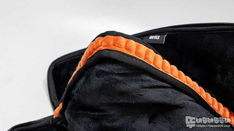 메인 포켓 내부를 살펴보면 가방 앞뒤 면에 스크래치 방지를 위한 인조 모피 극세사 안감 그리고 측면에는 에어쿠션이 적용되어 가방의 쏠림이나 측면 또는 수직으로 떨어뜨렸을 때 노트북 모서리가 받는 충격을 보호해 줍니다.