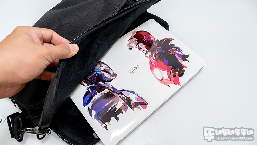 실제로 노트북과 액세서리를 넣었을 때 약 실측을 해보면 스펙 정보의 6cm 보다 작은 약 4.5cm 폭으로 생각보다 더 슬림한 편입니다.
