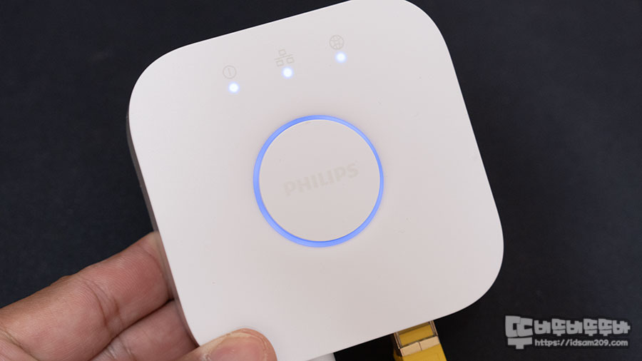 휴 브릿지 연결 후 세팅을 거치면 전면에 LED 인디케이터에 LED가 점등되며 작동상태를 확인할 수 있습니다.