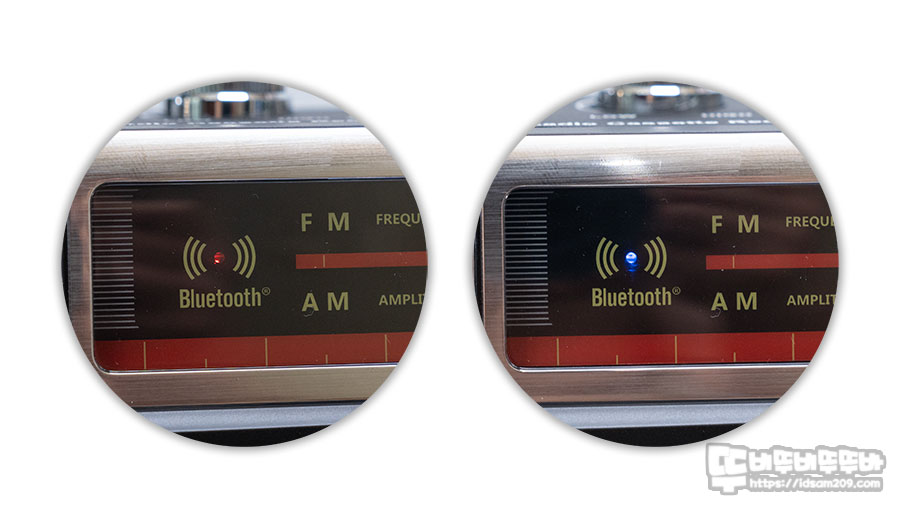 중앙 부분에 FM/AM 라디오 채널 부분은 정말 아날로그 느낌 그대로 모습으로 주파수 다이얼을 돌렸을 때 소리와 감성을 그대로 느낄 수 있으며 가장 왼쪽의 Bluetooth 부분은 블루투스, MicroSD 또는 USB 메모리로 작동 시 작동상태를 알려주는 LED 인디케이터가 내장되어 있습니다.