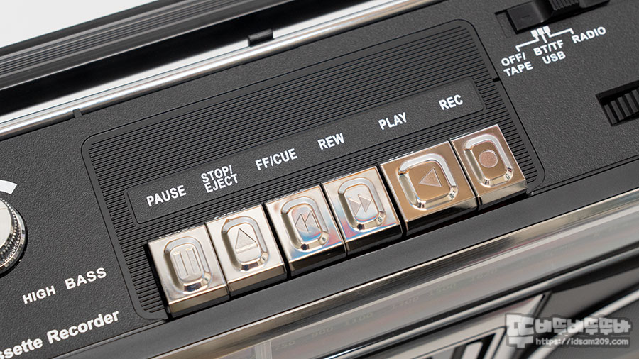 중앙의 카세트 데크 부분은 일시정지 / 정지/꺼내기 / 앞으로 감기 / 뒤로 감기 / 재생 / 녹음 순으로 작동하며 오른쪽에는 작동 모드 선택 가능한 3단 셀렉트 스위치로 테이프/ 블루투스, MicroSD/USB메모리, 라디오 순으로 선택하여 사용할 수 있으며 그 옆에는 FM/AM를 선택하는 셀렉트 스위치 그리고 앞쪽에는 조금 뻑뻑하게 돌아가는 라디오 채널을 선택하는 튜닝 다이얼로 구성되어 있습니다..
