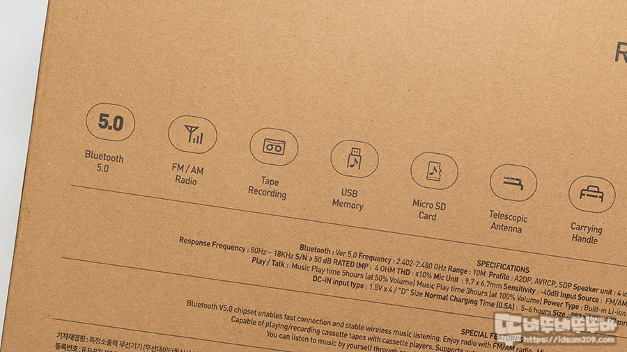 패키지에 FM/AM 라디오, USB 메모리 재생, MicroSD MP3 재생, 테이프 재생, AUX in, 이어폰/헤드폰 사용 지원 / 블루투스 / 음성녹음 등 All in one이라는 명칭이 어울리게 다양한 기능을 지원하는 내용이 설명되고 있습니다.