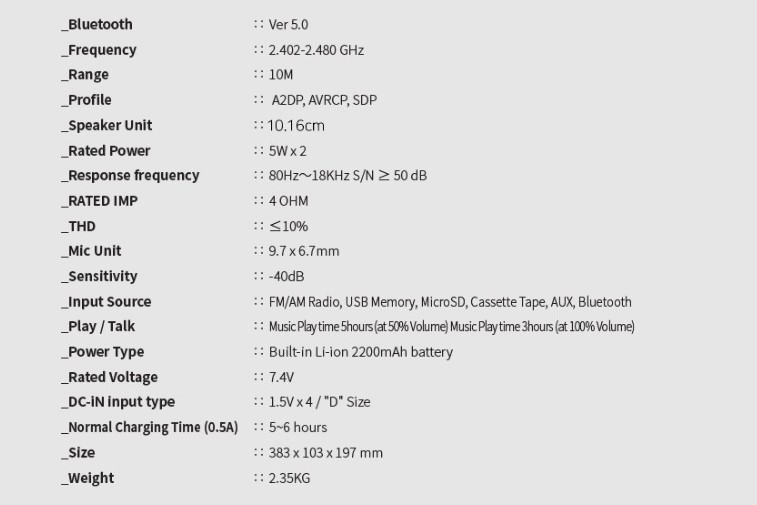 스펙 정보를 살펴보면 블루투스 버전 5.0 / 스피커 유닛 4인치 10.16cm / 출력 5W x 2 총 10W / 내장 배터리 2200mAh / 충전 시간 약 5~ 6시간 / 재생 시간 : 볼륨 50% 5시간, 볼륨 100% 3시간 / 이외 테이프 재생 / 녹음, USB 메모리, MicroSD, AUX in, FM/AM 라디오, 음성녹음 등 다양한 기능을 지원을 확인할 수 있습니다.