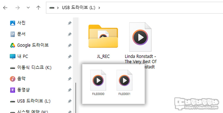녹음 방식은 모드 셀렉트 버튼은 Tape 또는 Radio 선택하여 재생되는 상태에서 측면에 ▶||/Rec 버튼을 길게 누르면 전면에 LED 인디케이터에 Blue LED가 점멸하면서 녹음이 되는 것을 확인할 수 있으며 녹음된 파일은 메모리에 JL_Rec 디렉터리 안에 File000에서 카운터 되는 형태로 Wav 파일로 저장이 됩니다.