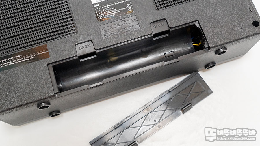 제품 뒤쪽은 타공으로 처리된 부분이 눈에는 보이지 않지만 베이스가 충만한 음악을 들을 때 뭔가 울림이 있는 것으로 보아 패시브 라디에이터로 추측되며 아랫부분에는 알카라인 D 타입 건전지 4개가 사용되는 건전지 소켓의 모습을 확인할 수 있습니다.