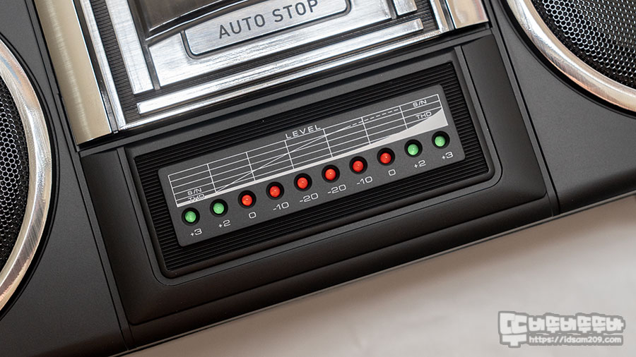 중앙의 테이프가 끝가지 재생되면 멈추는 Auto Stop 기능을 가지고 있다는 카세트 데크 모습 그리고 그 아래에는 제품이 작동될 때 반응하는 LED 레벨 메타로 구성되어 있습니다.