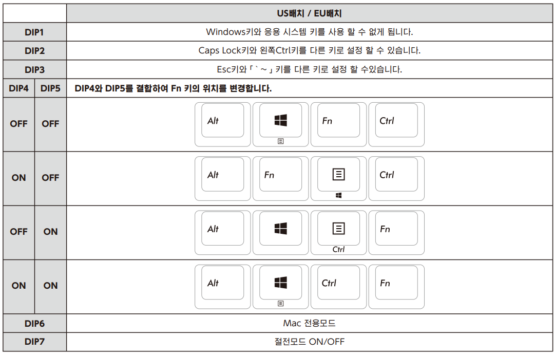 모든 DIP 기능은 키보드 연결 및 전원이 Off 상태에서 조작하시는 게 좋습니다.