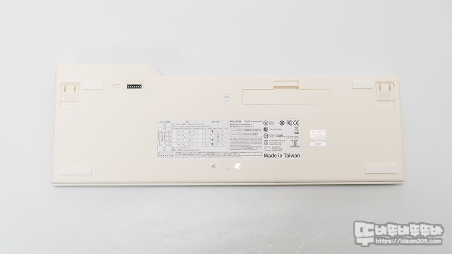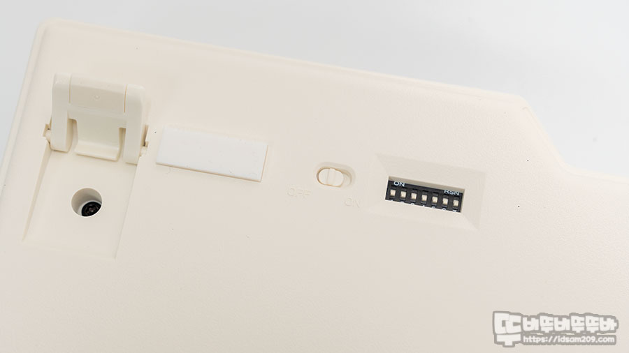 키보드 바닥면을 살펴보면 위/아래에 두툼한 미끄럼 방지 패드 모습과 높이 조절 다리, 무선 On/Off 스위치, 키보드 키 위치를 변경하는 DIP 스위치, 건전지 소켓을 확인할 수 있는데요.