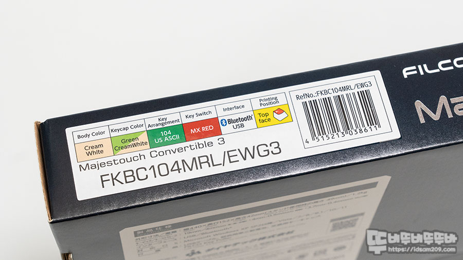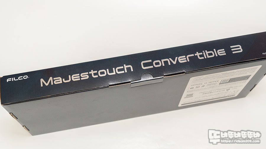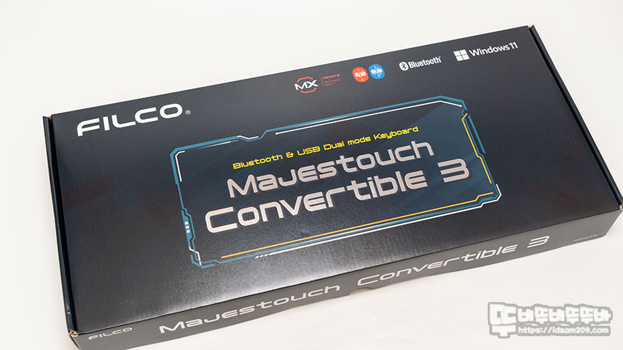 Filco 필코 마제스터치 컨버터블 3 패키지에는 빛이 반사되는 고급스러운 코팅 종이에 컨버터블 3가 인쇄된 모습과 전통적인 체리 MX 스위치 사용, 유선/무선, 블루투스 지원에 대한 내용을 확인할 수 있습니다.