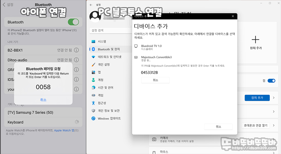노트북과 아이폰 2대 총 3개의 디바이스를 멀티 페어링 하여 기기 전환 속도를 확인해 보면 아이폰에서 아이폰, 아이폰에서 노트북으로 전환 시 약 3.XX 초 수준으로 빠른 전환이 가능한데요.