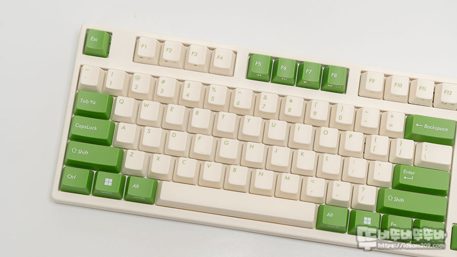 바디 컬러 : 크림 화이트, 키캡 컬러 : 그린/크림 화이트, 키 배열 : 표준 104 US 배열, 스위치 종류 : 체리 적축, 인터페이스 : USB (유선)/ 블루투스 (무선), 키캡 인쇄 위치 : 상단 표면 각인 등의 내용을 확인할 수 있으며 그 외 정보로는 USB (유선) 및 블루투스 (무선) 4개의 디바이스 페어링을 지원합니다.
