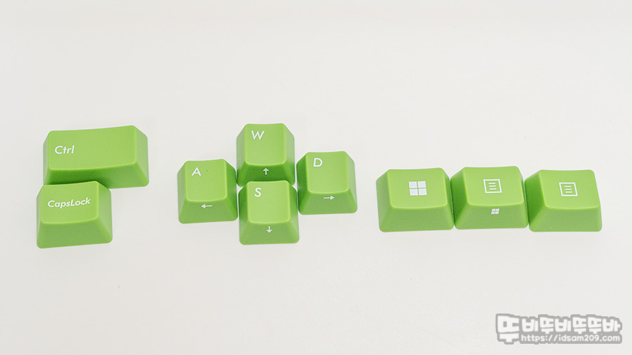 교체용 키캡은 Caps Lock과 R_Ctrl 키 위치 변경 시 사용할 수 있는 키캡과 WASD 키캡 측면에 방향 키가 측각으로 인쇄된 키캡, 그리고 DIP 변경에 따라 스페이스 우측의 모디키 구성에 맞게 사용할 수 있게 구성되어 있습니다.
