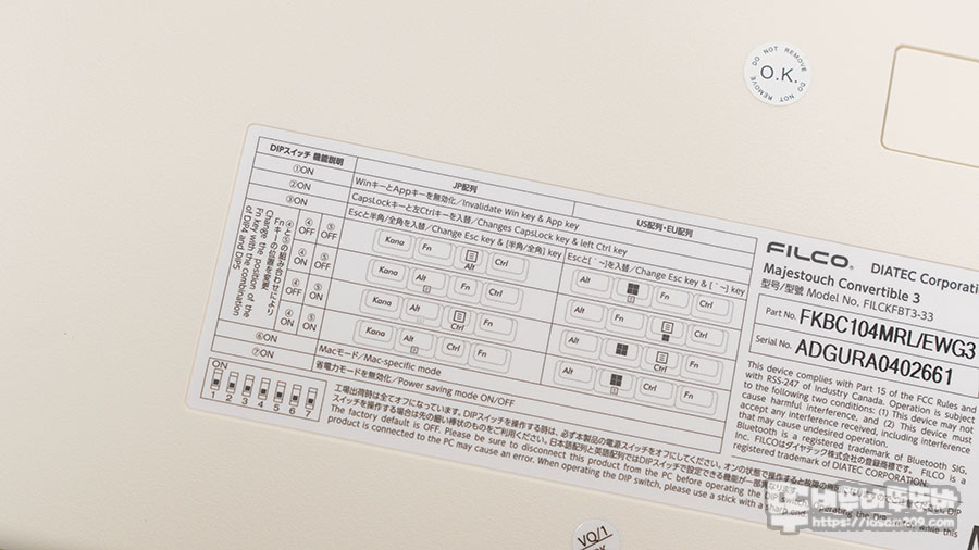 기본적으로 F1 ~ F12까지 볼륨 및 미디어 제어, 절전 및 복귀 모드 등 윈도우즈에서 사용 가능한 기능 그리고 Mac에서 사용하게 되는 F13 ~ 15, fn, Clear 기능 그리고 옵션과 커맨드 기능에 대한 기능 인쇄되어 있으니 DIP 모드 변경 후 Mac OS 기능을 사용하시기 바랍니다.