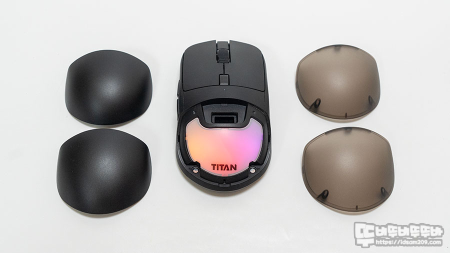 팜커버는 LED 투과가 가능한 스모그 형태와 LED 투과가 안 되는 솔리드 형태 여기에 2mm 두께감을 주는 하이 타입과 완만한 경사면의 미드 타입 팜 커버 2종이 기본으로 제공되어 마우스 그립 느낌에 변화를 줄 수 있어 활용도가 좋은 편입니다.