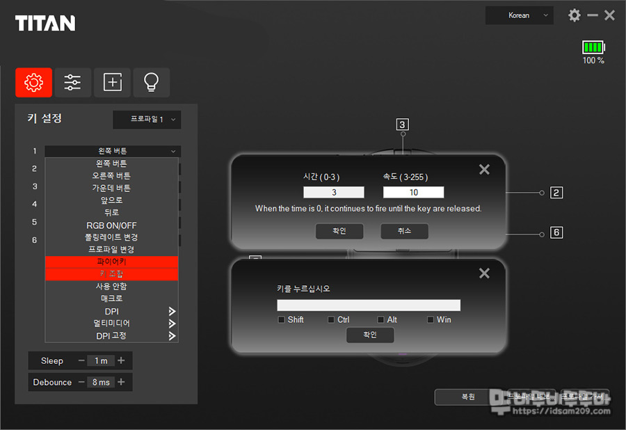 버튼 설정 메뉴를 살펴보면 게임에 도움이 되는 파이커, 키 조합 기능을 확인할 수 있으며 마우스 절전 시간 (Sleep) 조절 및 디바운스 타입 설정이 가능합니다.