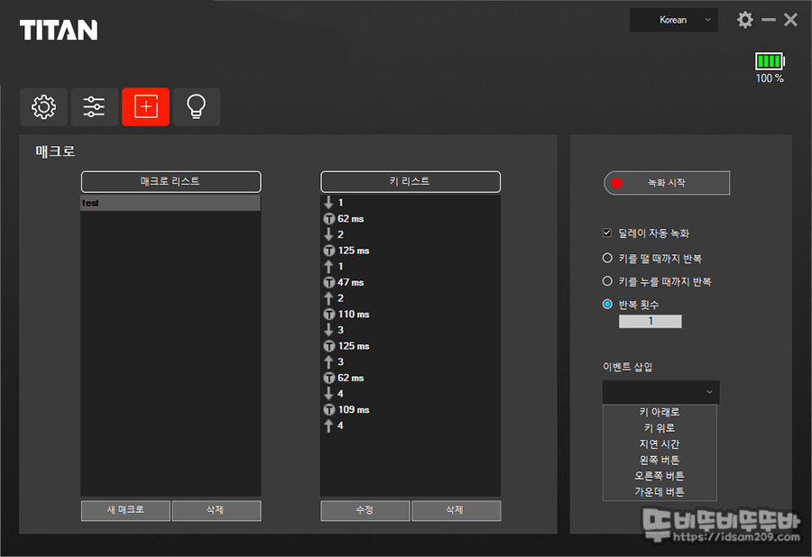 매크로 부분은 기존 제품의 매크로 기능과 크게 차이가 없는데 새 매크로 클릭 - 매크로 이름 지정 - 녹화시작 - 키 입력 - 녹화 종료 순으로 매크로를 기록하게 되며 키 리스트에 마우스 오른쪽 버튼을 눌러 키 수정 또는 삭제가 가능합니다.