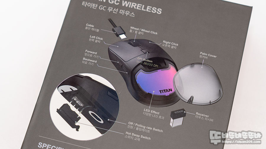제닉스에서는 2016년에 STORMX G3 게이밍 마우스에서도 핫스왑 방식을 적용했던 적이 있는데 2023년에 TITAN GC WIRELESS을 통해 다시 선보이네요.