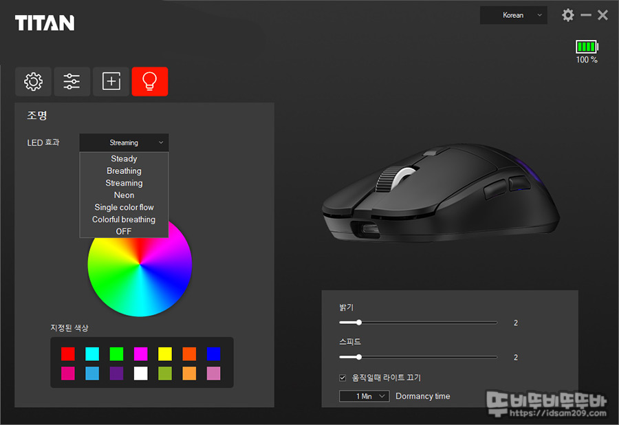 마지막으로 RGB LED 효과 메뉴는 마우스 뒤쪽 부분에 은은하게 빛나는 LED 밝기, 색 변화 속도, 효과를 선택할 수 있는데요.