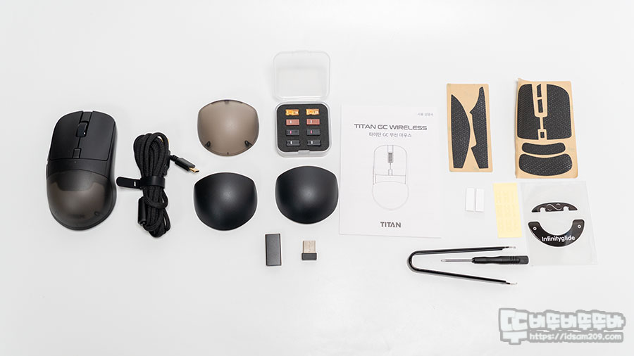제품은 GC 무선 마우스 본체, 팜 커버 4종, 스위치 5종, 러버 그립패치, 글라스 피트, 파라코드 케이블, 스위치 서페이서, 스위치용 피트, 리시버 연장 젠더, 2.4GHz 무선 리시버, 스위치 교체 툴로 구성되어 있습니다.