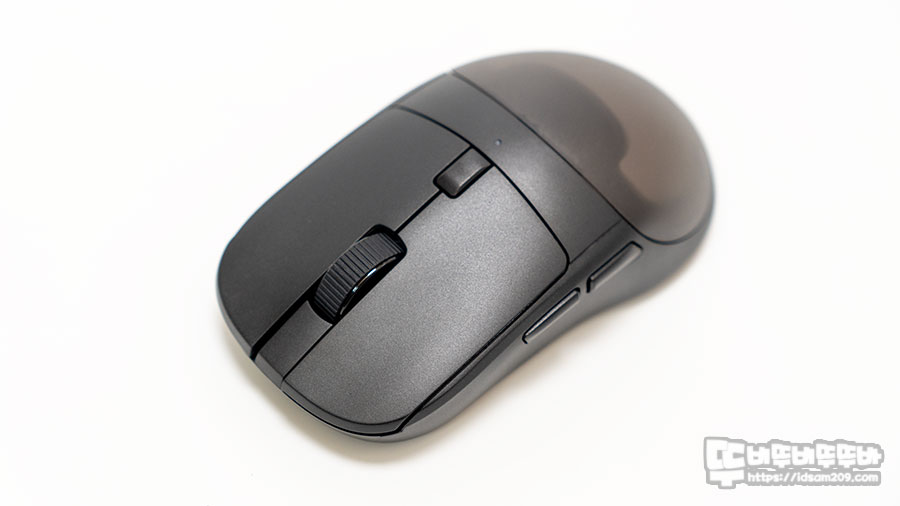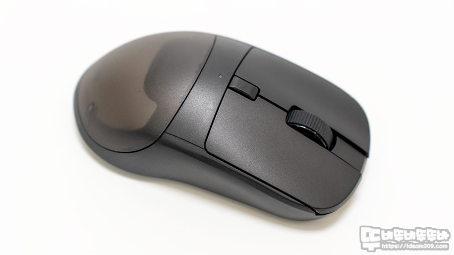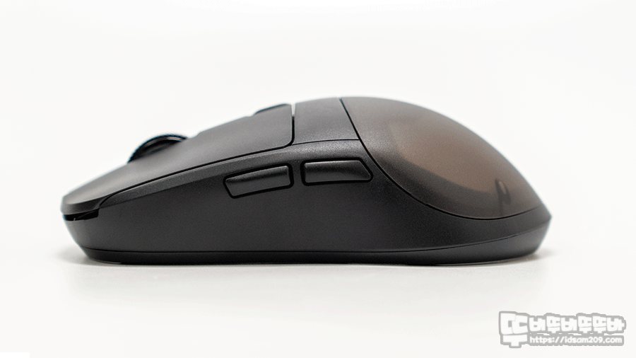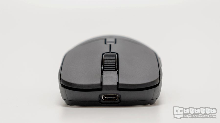 절개형 버튼과 두툼한 휠 스크론, DPI 버튼 그리고 뒤쪽에 작게 표현되는 DPI LED 인디게이터, 오른손잡이용 왼쪽 사이드 버튼 등 전형적은 대칭형 마우스 디자인의 모습을 확인할 수 있네요.