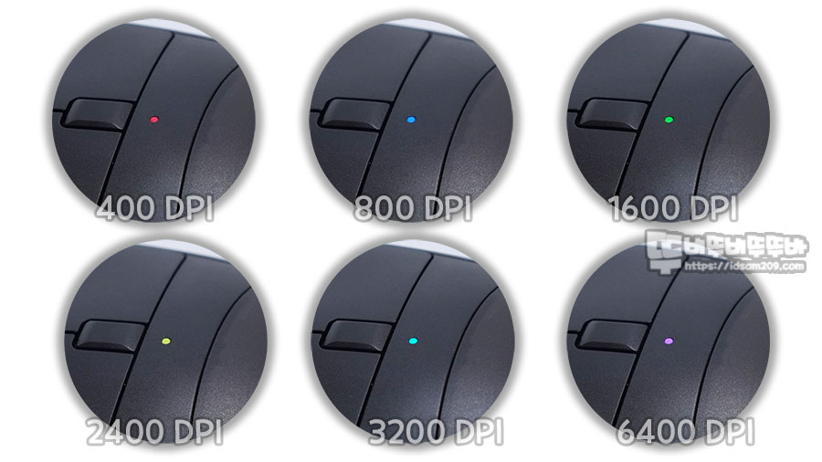 LED 인디케이터로 보게 되는 DPI 기본 컬러는 레드(400) - 블루(800) - 그린(1600) - 옐로우(2400) - 스카이 블루(3200) - 퍼플(6400)로 표현되며 DPI 조절바 앞에 있는 컬러 박스 선택으로 컬러 변경이 가능합니다.
