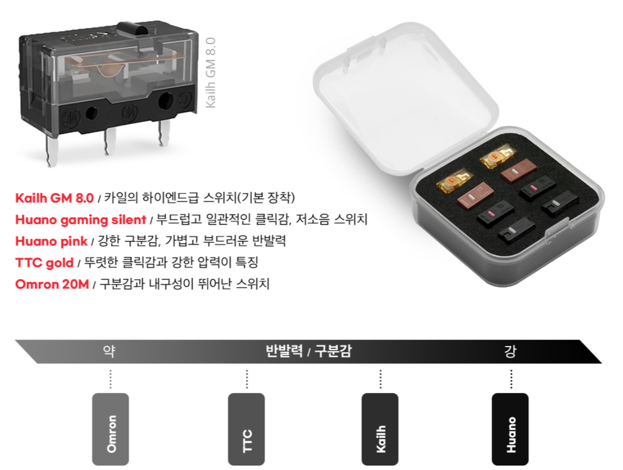스위치 핫스왑 기판 채용 및 교체용 스위치 4종, 글라스 피트, 미끄럼 방지 그립 패치, 이전 시리즈에서 계승된 팜 커버 교체 등 마우스 커스터 마이징에 필요한 모든 것을 지원하는 게 특징인데요.