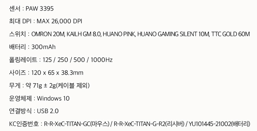 픽셀아트 PAW 3395, 최대 26,000 DPI 지원, 300mAh 배터리 내장, 핫스왑용 스위치 제공 (옴론 20M, 카일 GM8.0, 후아노 핑크, 후아노 게이밍 저소음 10M, TTC 골드 60M), 폴링레이트 125 / 500 / 500 / 1000Hz 지원, 교체용 팜커버 지원 등을 확인할 수 있습니다.