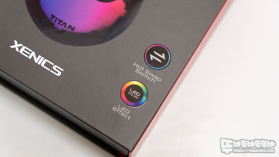 패키지 뒷면에 인쇄된 제품 구성에서는 교체가 가능한 팜커버, 핫스왑 스위치 교체 방식에 대한 설명이 눈에 띄네요.