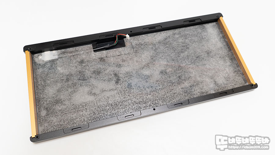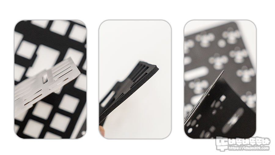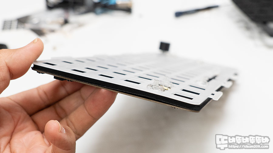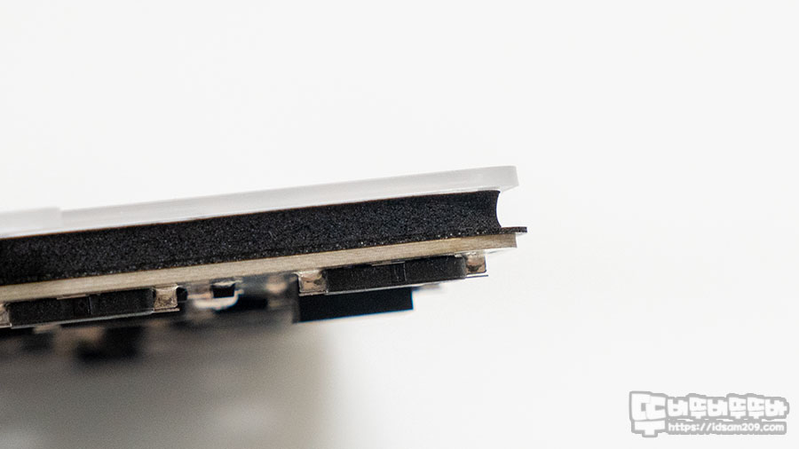 이번에는 보강판이 결합된 기판 부분을 분리해 보면 왼쪽부터 순서대로 폴리카보네이트 보강판, 3mm 프렛 폼, 스위치 패드 그리고 기판으로 구성되어 있음을 확인할 수 있는데요.
