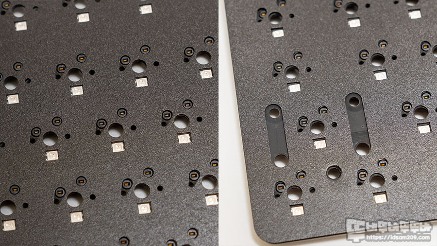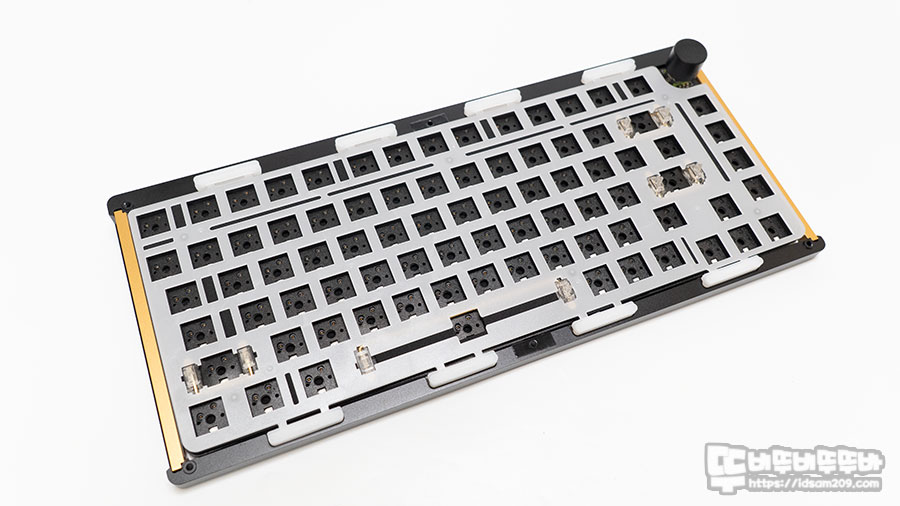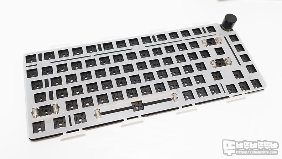 전체적으로 보면 폴리카보네이트 보강판과 핫스왑 소켓이 내장된 기판이 보이는 베어본 모습으로 스태빌라이저 장착과 스위치 장착 그리고 키캡만 꽂으면 바로 키보드 사용이 가능한데요.