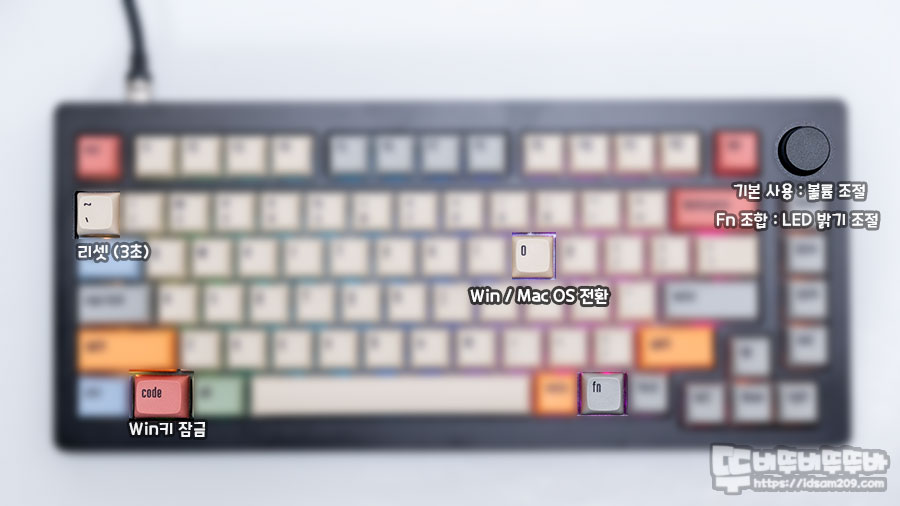 볼륨 노브는 Fn 조합으로 사용 시 LED 라이팅 밝기를 조절할 수 있으니 참고하시기 바랍니다.