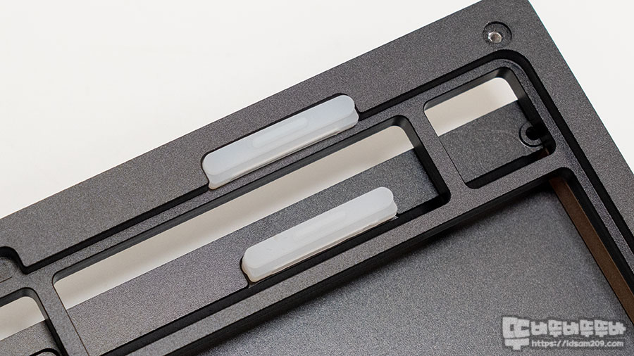 보강판이 결합된 기판을 뒤집어보면 핫스왑 소켓 부분이 타공처리된 흡음재와 알루미늄 하우징 하판 표면에 부착하는 PET패드 모습을 보게 되는데요.