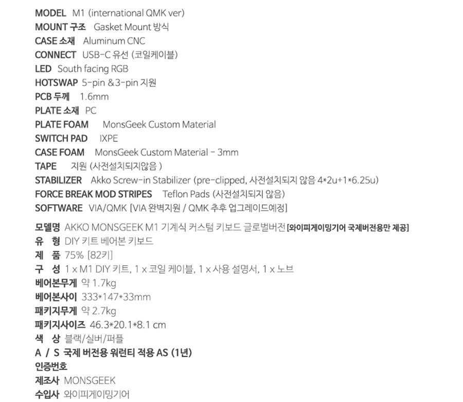 제품은 M1 베어본 본체, 투명 블리스터 커버, USB-C to A 케이블, 사용 설명서, 보강판용 스태빌라이저 세트, 여분의 가스킷 실리콘, 그리고 여분의 나사로 구성되어 있습니다.