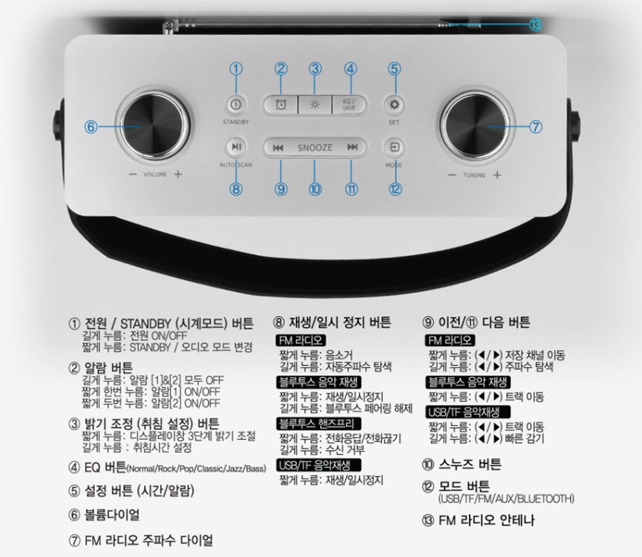 블루투스와 SD/USB 메모리를 이용한 MP3 플레이어 기능 FM 라디오 기능 등 다양하게 사용할 수 있는 All-in-One 제품이기에 활용도가 좋습니다.