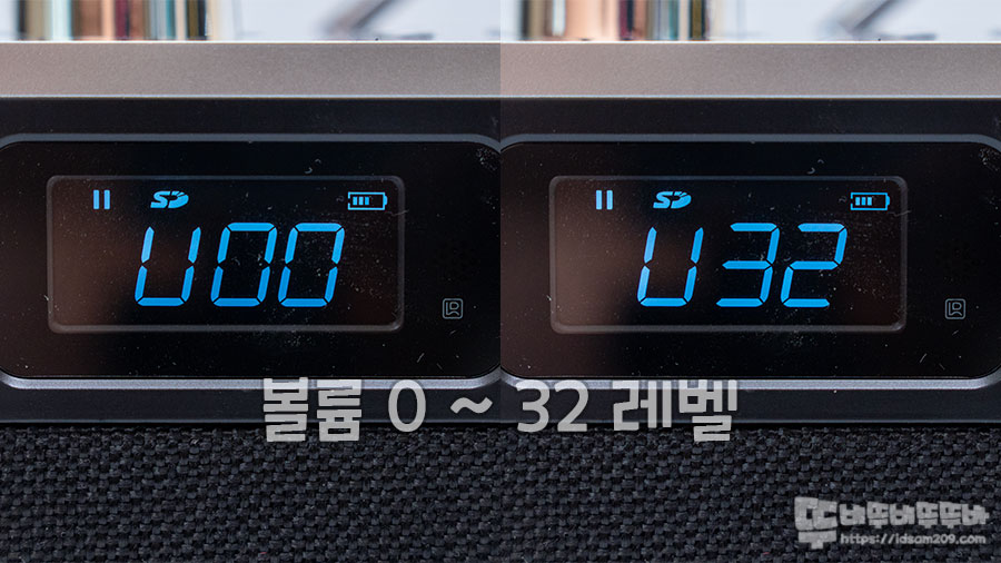 볼륨은 0 ~ 32 레벨로 조정이 가능하며 블루투스 페어링 시 스마트폰과 볼륨 조절이 연동되어 사용됩니다.