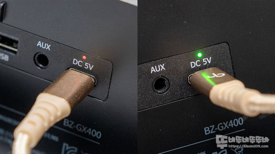 충전 중에는 Red LED 점등으로 표현되며 완충 시에는 Green LED로 표현되어 충전상태를 확인할 수 있습니다.