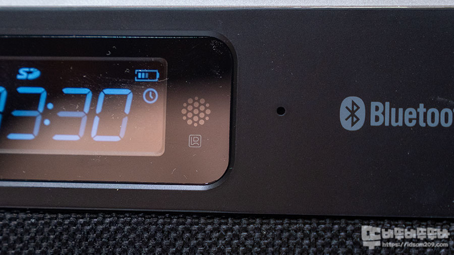 실제 사용을 해보니 기능 버튼의 경우 대부분 짧게 또는 길게 누르는 형태로 2가지 기능을 가지고 있으며 그중에 전원 버튼 (Standby)은 길게 눌러 전원 On/Off, 짧게 눌러 스탠바이 형태로 유지되는데 전원 On 이후에 전원 버튼을 짧게 한 번 더 누르면 재생 모드로 SD/USB/FM 라디오/AUX/ 블루투스 모드 기능을 선택할 수 있습니다.
