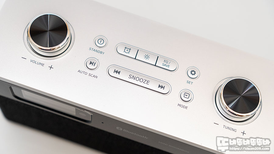 제품의 상단부분은 은색으로 도색 처리된 메탈 느낌의 깔끔함이 돋보이는데 볼륨과 FM 라디오 채널을 선택을 담당하는 노브와 컨트롤 버튼이 위치하고 있는데요.