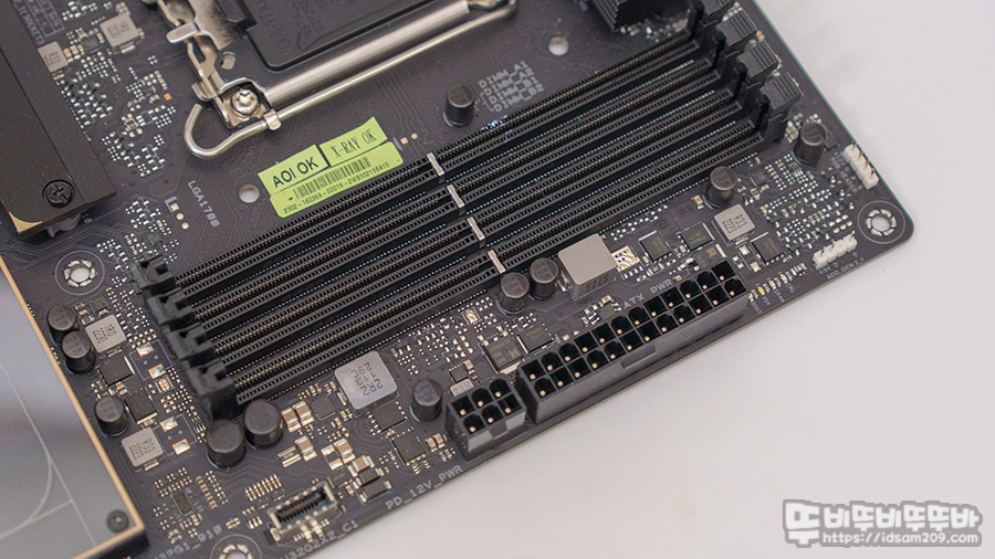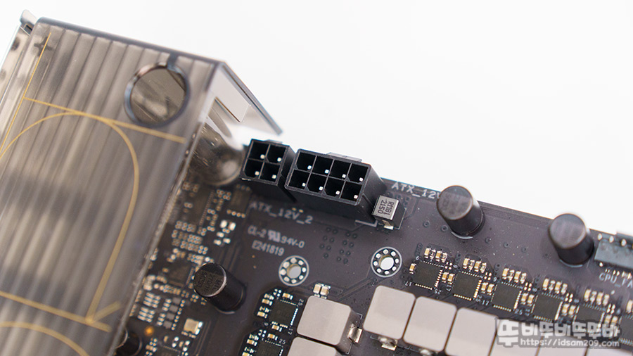 메인보드 위쪽에 CPU 쿨링팬 관련 CPU_FAN, CPU_OPT, AIO_PUMP 소켓 모습을 확인할 수 있는데 AIO_PUMP 소켓은 워터자켓이 장착되는 CPU 소켓 아래쪽에 위치했으면 하는 아쉬움이 있네요.