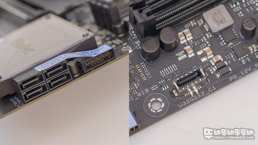 메인보드 24핀 커넥터 아래로는 USB 3.2 Gen 2x2 Type-C 소켓이 내장되어 케이스 전면 USB-C 단자를 통해 20G 데이터 전송 및 60W 퀵 차지가 가능하고요.