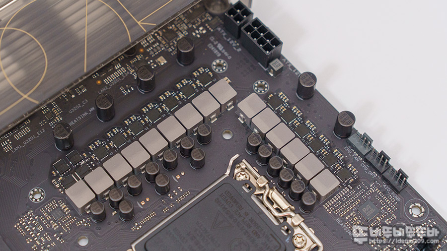I/O 실드 안쪽에 위치한 두툼한 전원 방열판을 분리해 보면 촘촘하게 구성된 12+1 페이즈(페이즈당 50A) 파워 스테이지로 최신 13세대 및 12세대 인텔 코어 프로세서를 완벽하게 지원합니다.