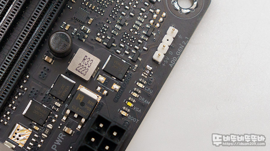 메인보드 상단 끝자락에 +12V RGB 헤더(4핀) 그리고 +5 ARGB(3핀)이 위치하고 있어 케이스, 일체형 수랭 라디에이터에 부착하는 쿨링팬 연결에 용합니다.