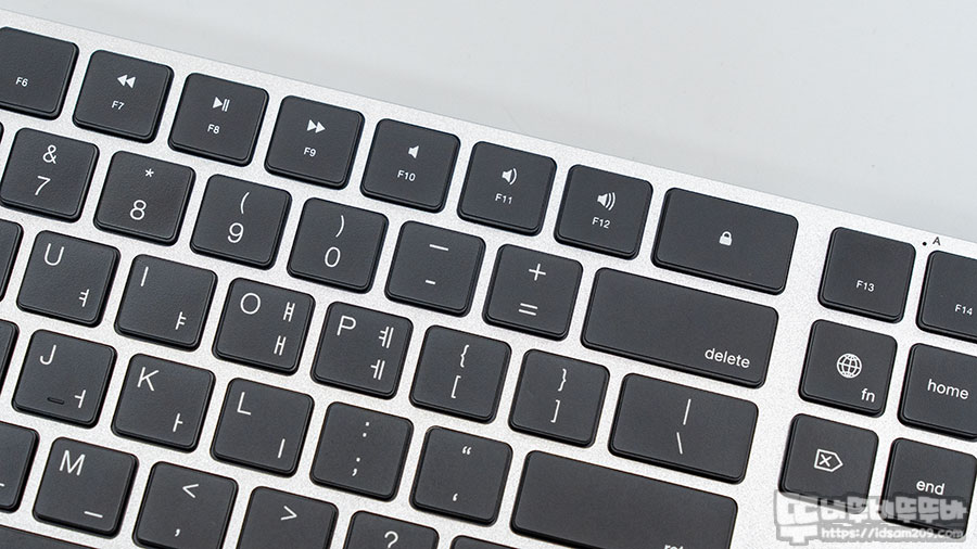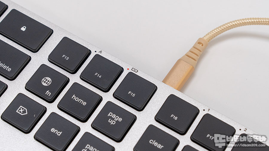 원래 애플 매직키보드는 F12 키 옆의 터치ID 기능이 있지만 정품 키보드가 아니기에 버튼으로 화면 잠금/해제 기능을 제공하며 지구본 모양의 Fn키는 평션열의 애플 전용 기능 키를 펑션 키로 사용하고 싶을 때 멀티 페어링 시 페어링 된 기기를 선택할 때 유용하게 사용할 수 있습니다.