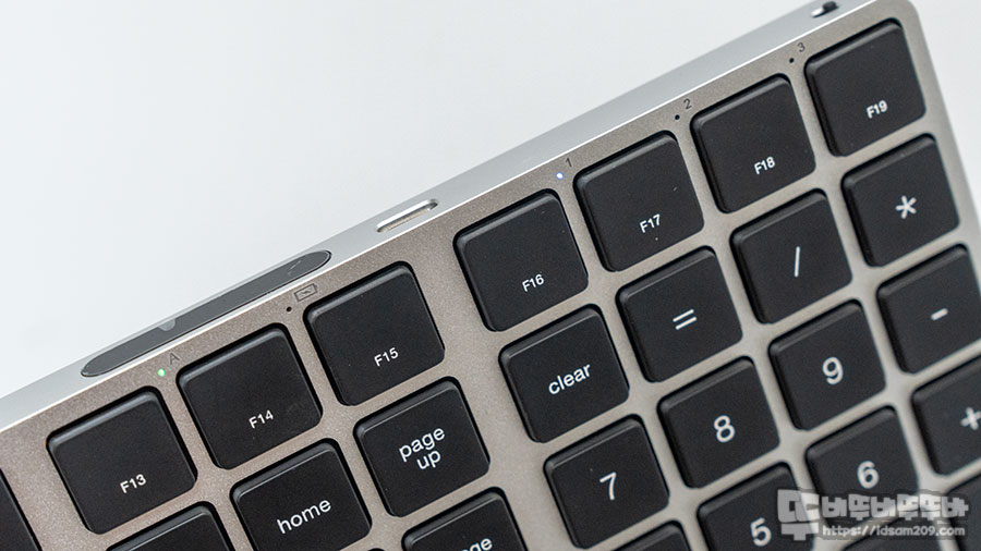 키보드 상단의 LED 인디케이터는 Capslock On, 충전 및 배터리 잔량 부족, 멀티 페어링 기기 1, 2, 3에 대한 표현을 해주기에 직관적인 확인이 가능합니다.