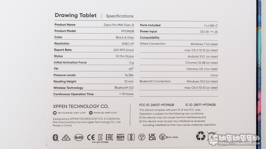 패키지 뒷면에는 A5 크기의 작업 영역, X3 Pro 칩셋, 16K 레벨 입력 지원에 대한 포인트 아이콘과 스펙 정보를 확인할 수 있는데요.
