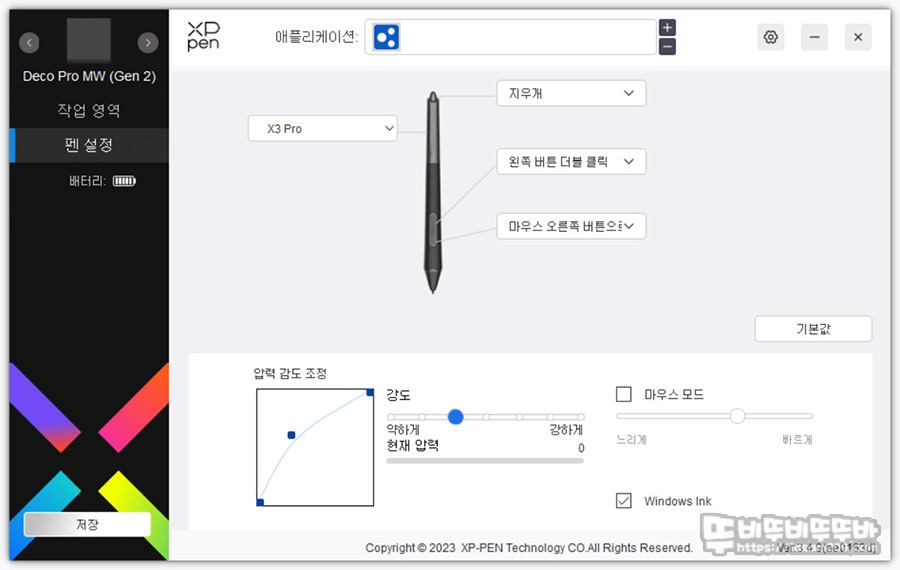 스타일러스 펜의 기능에서는 버튼 기능 변경 및 필압 감도 조정이 가능하며 마우스처럼 사용 가능한 마우스 모드와 브러쉬 사용 시 필압 적용이 필요한 경우 체크가 필요한 Window ink 옵션을 확인할 수 있네요.