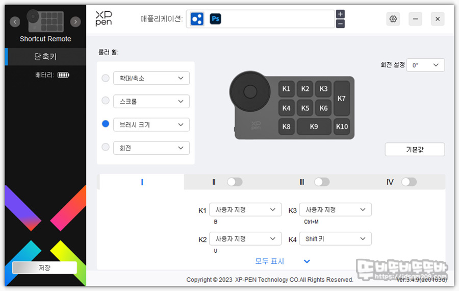 무선 타블렛 키보드 메뉴는 휠 스크롤 중앙 버튼을 눌렀을 때 메인 기능 4가지와 키보드로 사용가능한 10가지 기능 키 설정을 할 수 있으며 필요에 따라 I / II / III / IV로 표시되는 키 그룹을 선택하여 최대 40개의 단축 또는 기능 키 설정이 가능합니다.