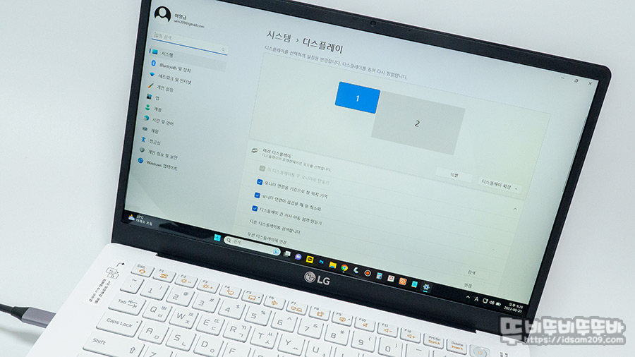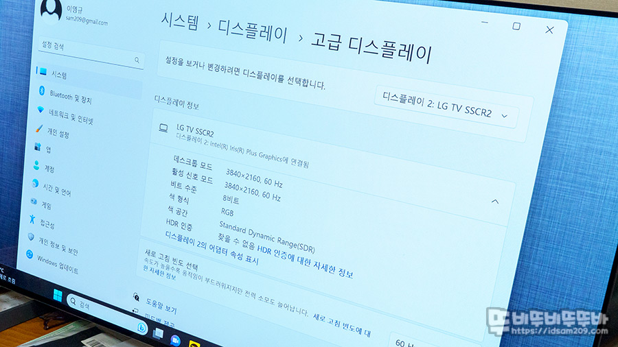 노트북의 화면을 듀얼 디스플레이로 설정 후 TV 외부입력을 통해 4K 60Hz 화면으로 출력이 가능하네요.