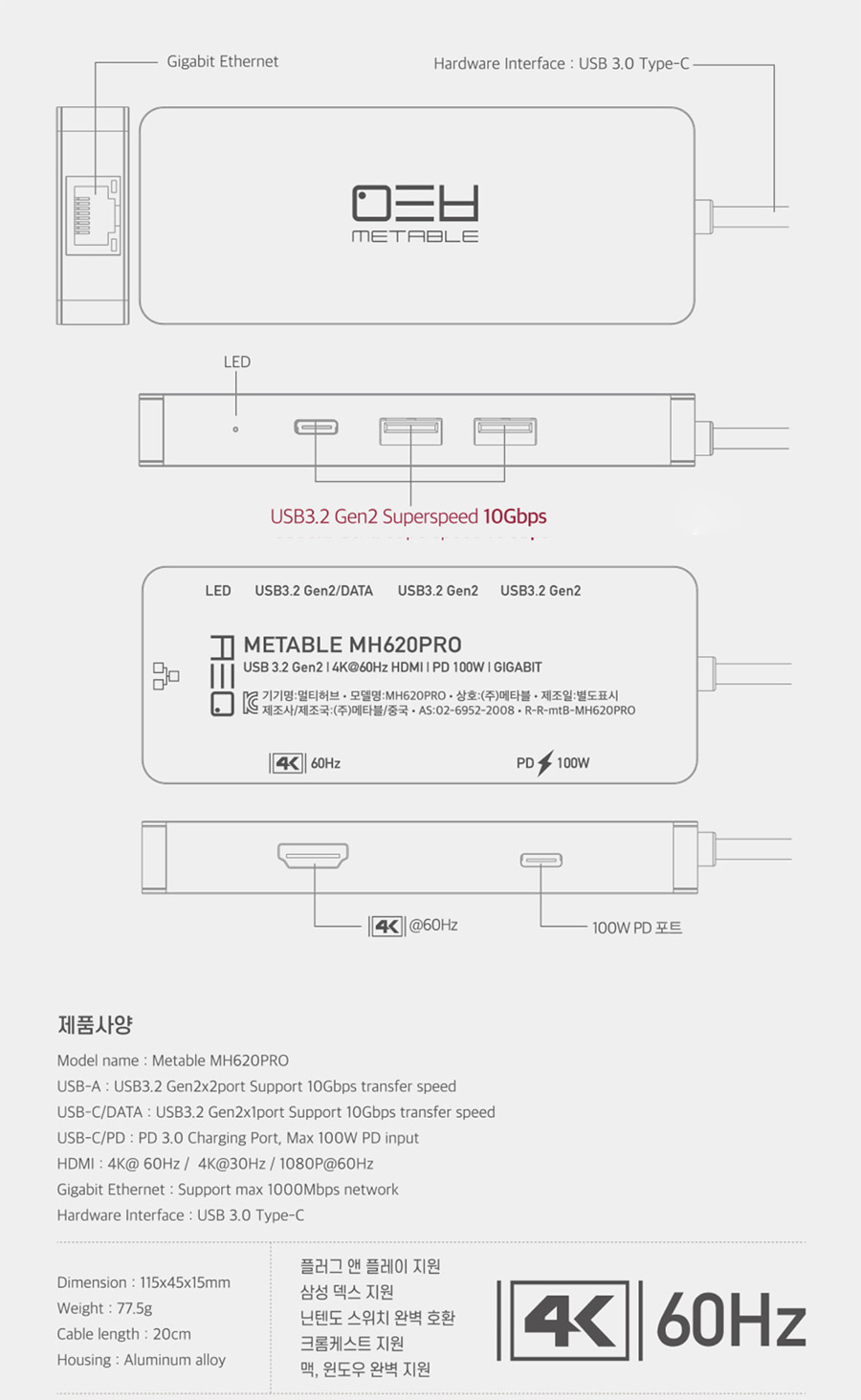 메타블 MH620PRO 6in1 HDMI 4K60Hz Gen2 멀티 USB허브(USB3.2 Gen2) : 메타블
