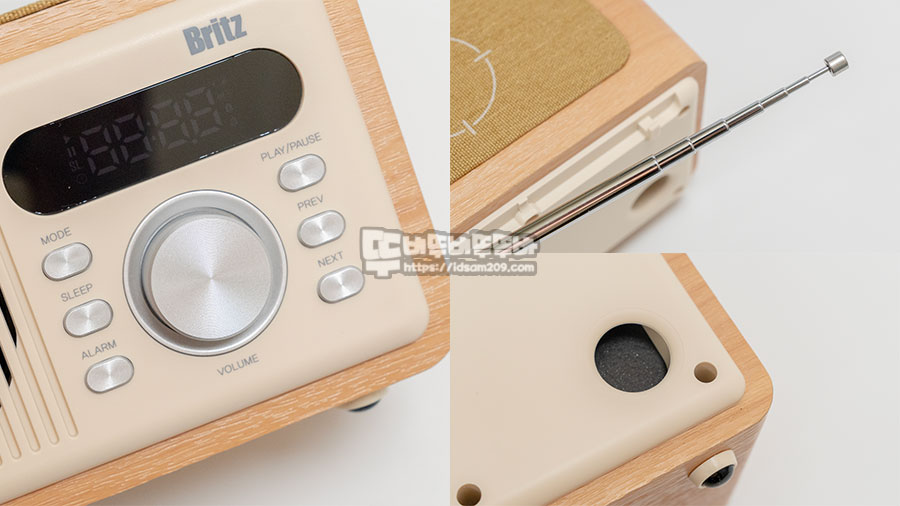 스피커 전면부는 66mm 스피커 부분과 오른쪽에 위치한 LCD창과 조작 버튼, 뒷면에 텔레스코픽 안테나와 에어덕트가 적용된 것을 확인할 수 있으며 상단에 무선 충전 부는 패브릭 소재가 사용되어 스마트 기기가 밀리지 않고 안정적인 거치가 가능합니다.